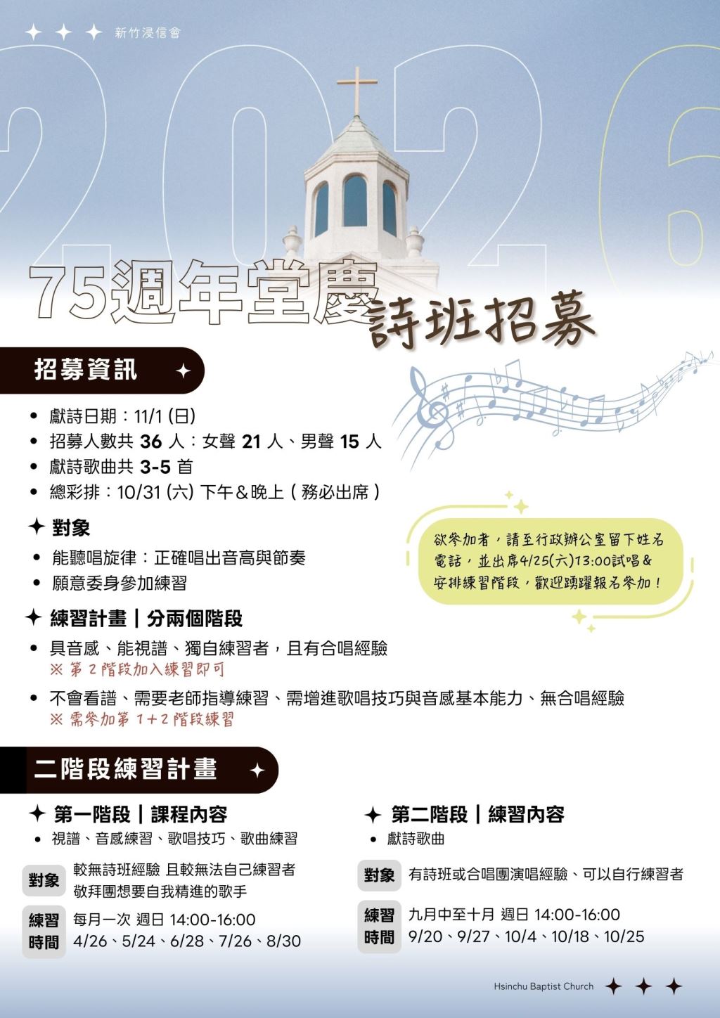 欲參加者,請至行政辦公室留下姓名/電話,並出席4/25(六)13:00試唱&安排練習階段,歡迎踴躍報名參加!
